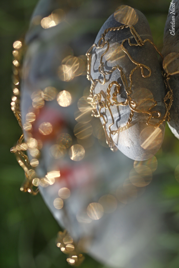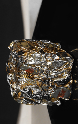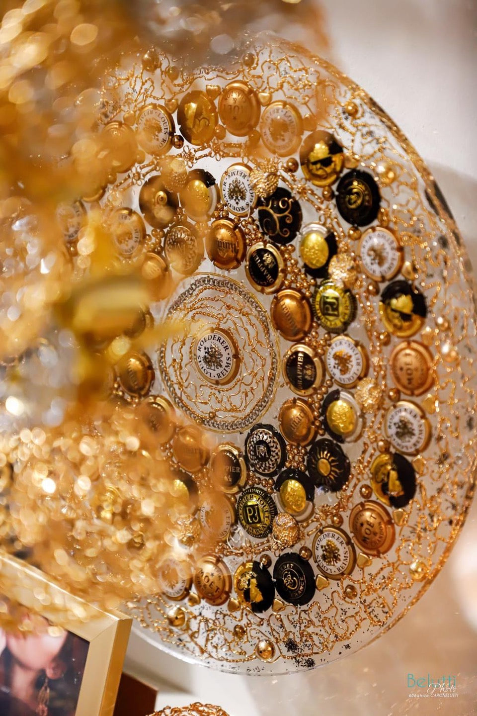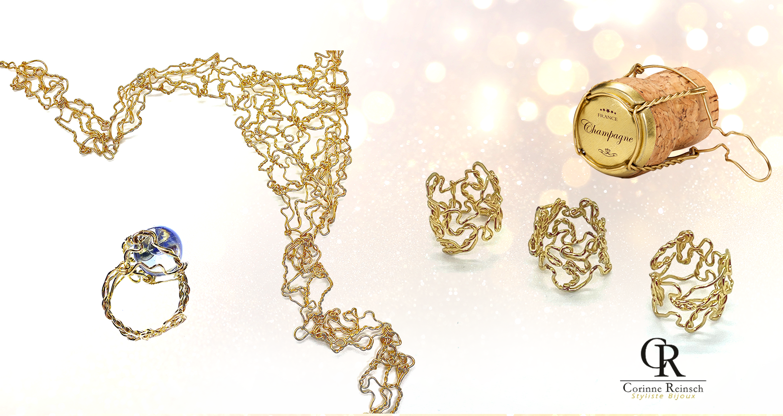 L'artiste est pionnière dans l'art de la métamorphose d'inattendus muselets de champagne doré à l'or fin, argentés ou cuivrés qui, entre ses mains s'assemblent en une alchimie poétique donnant naissance à des bijoux originaux, des robes événementielles et plus récemment des tableaux et des sculptures.