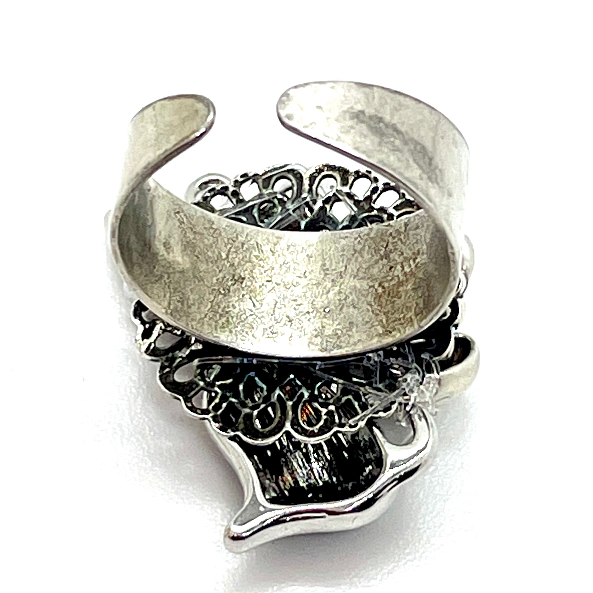 La bague CATY créée avec un un chat noir en émail cloisonné "cousu main" sur le support à trous de la bague.