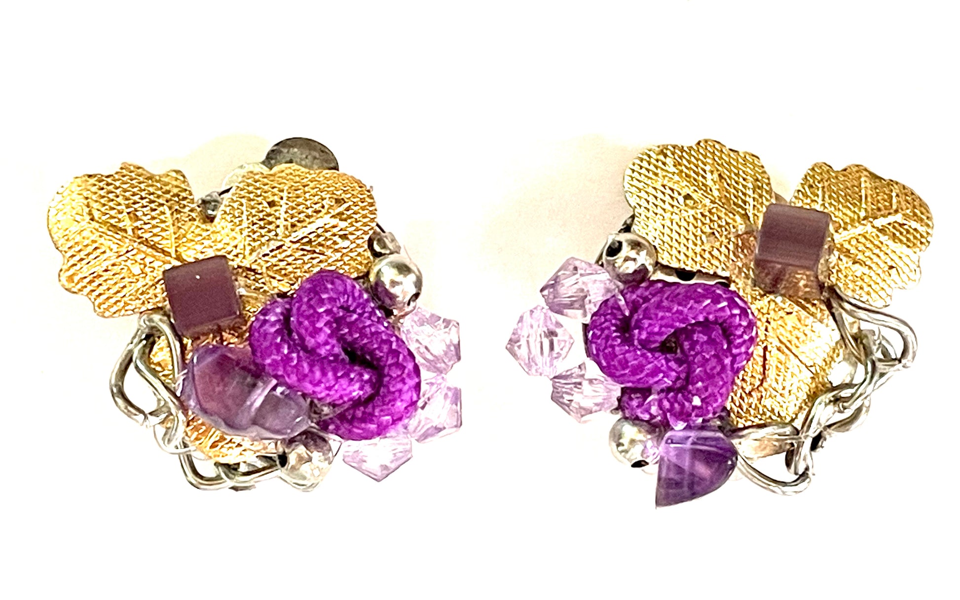 Composition: feuilles en métal fin, noeud en passementerie violette, cube en verre parme, petites perles en verre parme, éclats en améthyste.