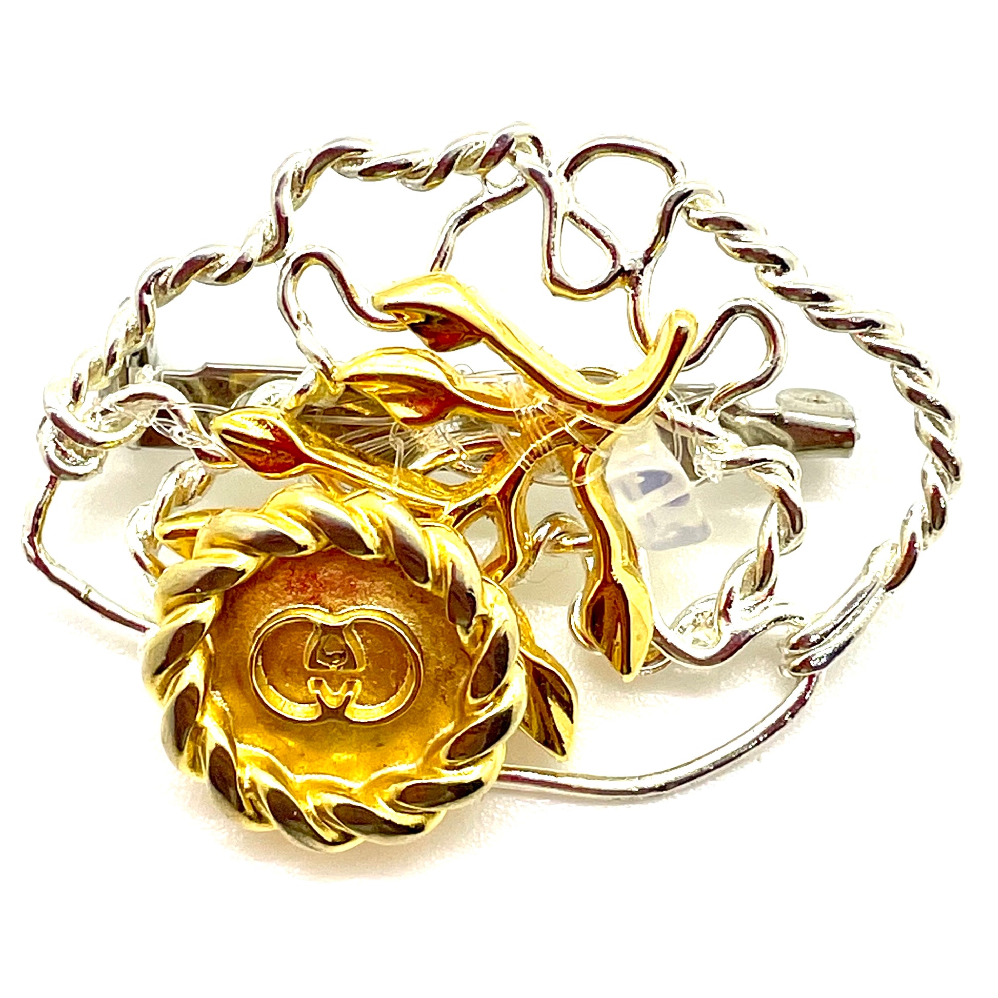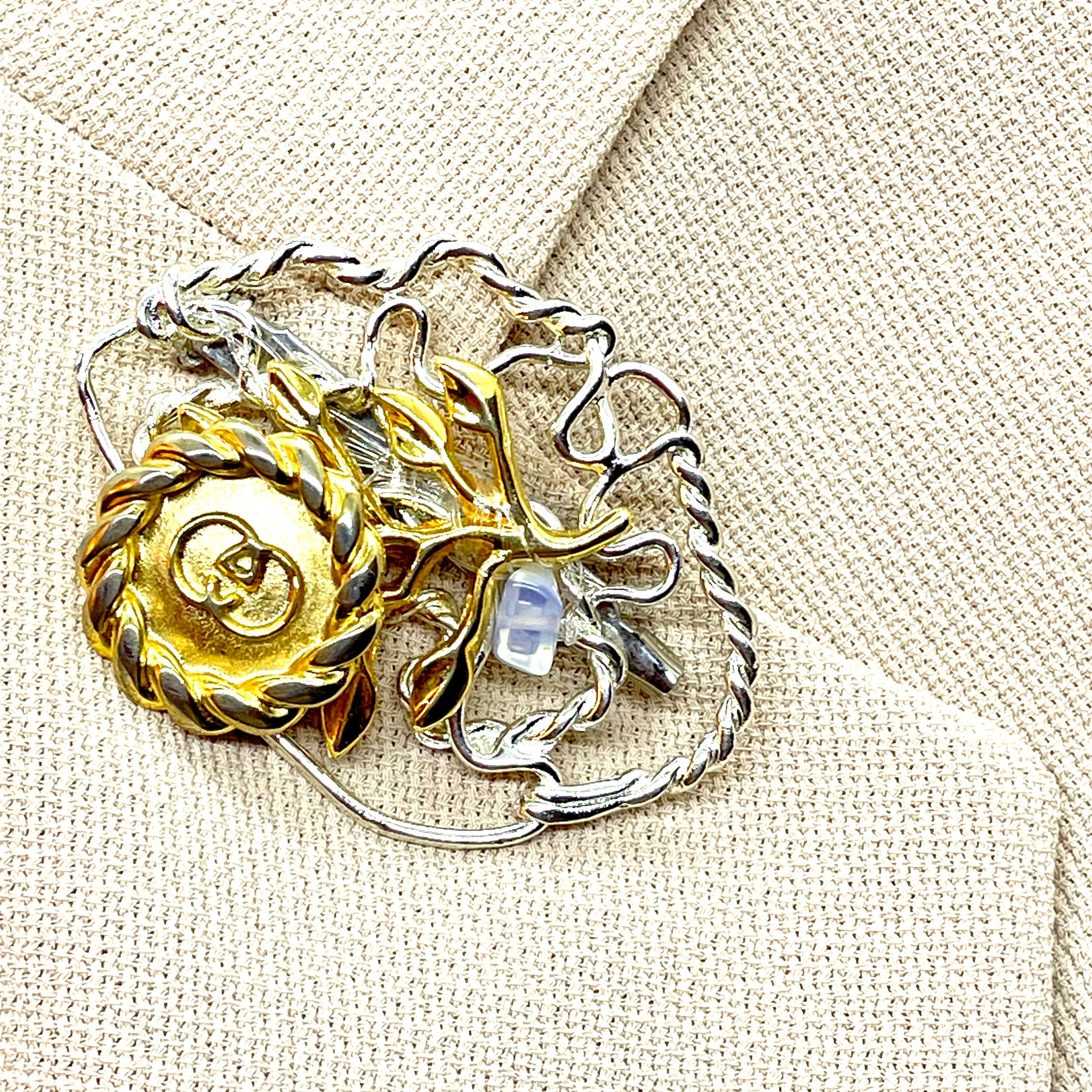 Elle est composée d'un bouton vintage de Haute couture doré et d'une pièce en métal doré représentant une branche végétale , le tout cousu main sur sa base en muselet de champagne argenté..
