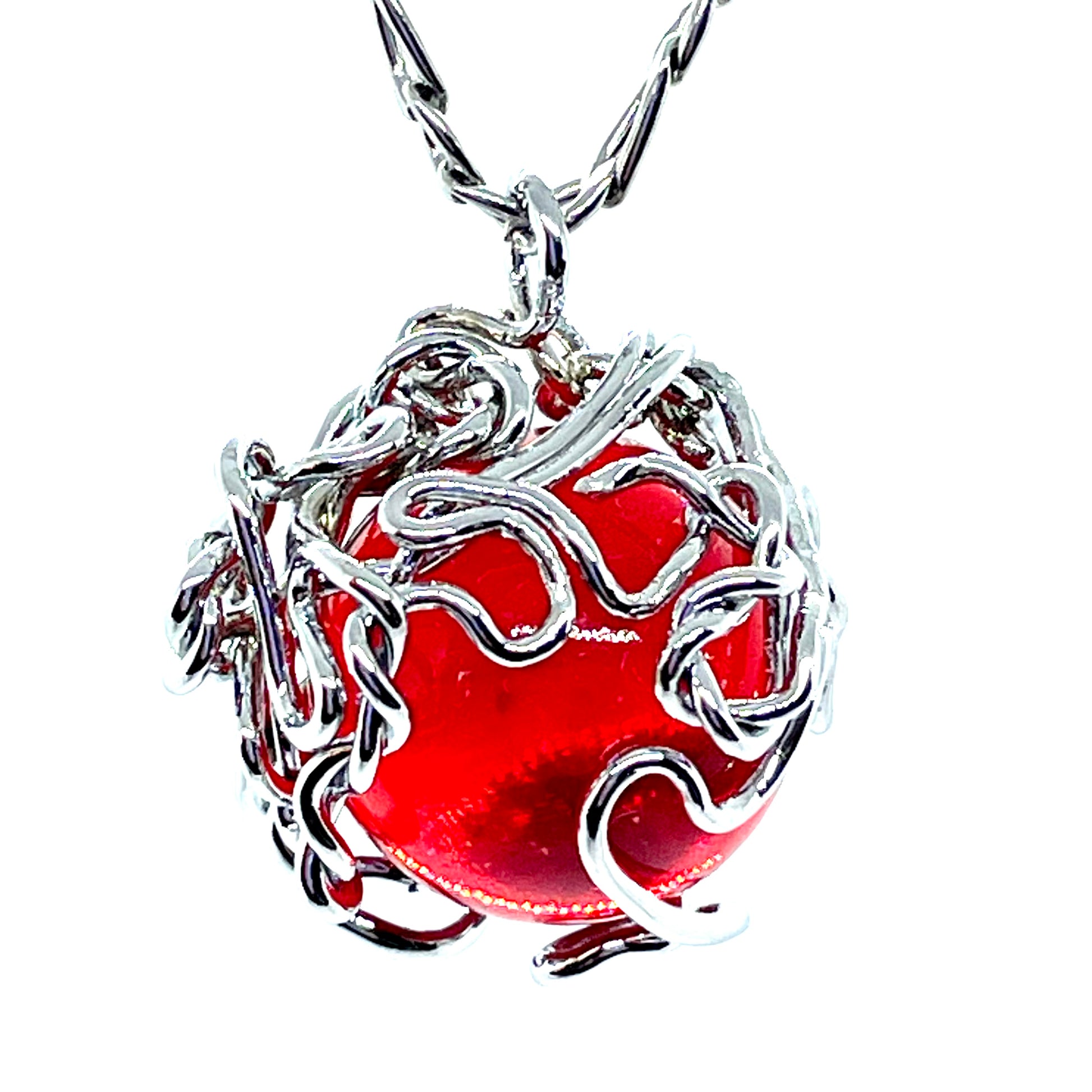Collier BUBBLE avec une bille en verre rouge de 1cm de diamètre entourée de muselet de champagne chromé avec une chaine aux maillons plats, longueur déployée : 47cm.
