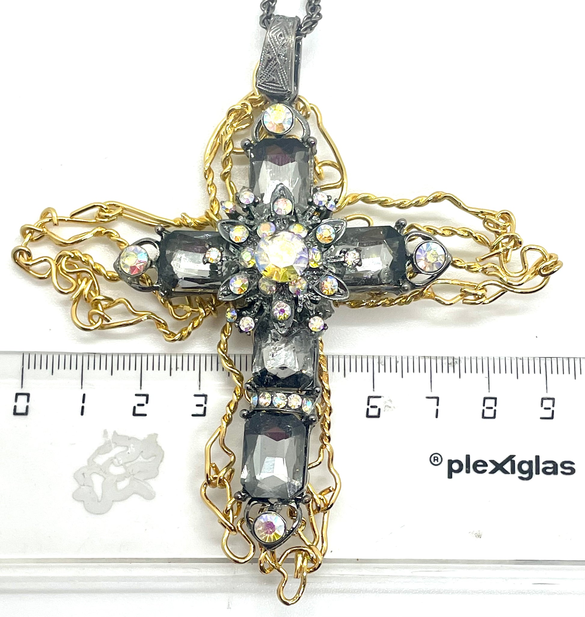 Une autre croix en métal gris antracite est formée avec des cristaux gris, parsemé de cristaux irisés et blanc. La croix mesure 9CM de large et 9CM de long.