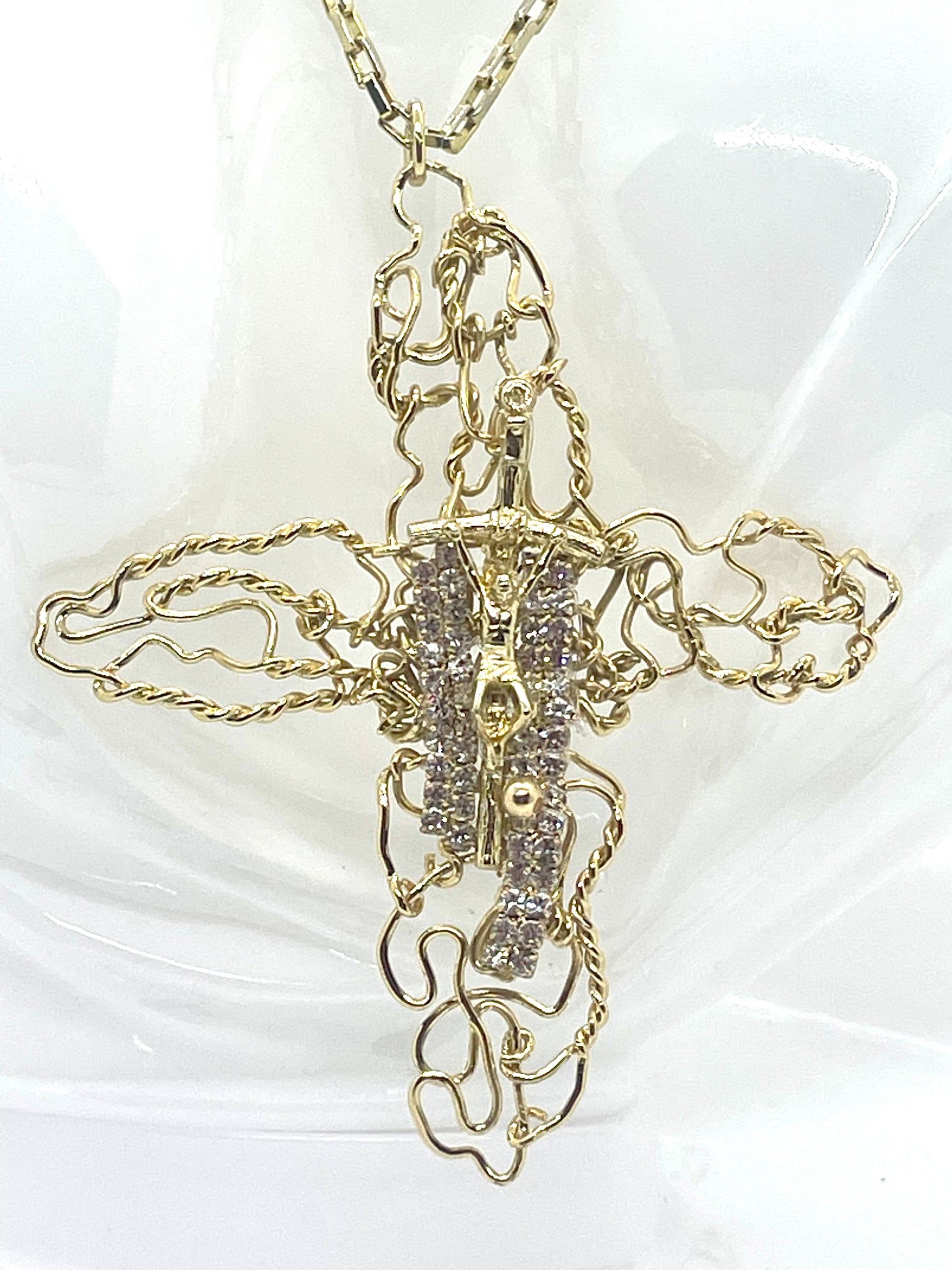 Le Collier CROIX SITAEL est créée à partir de muselets de champagne revisités, dorés à l'or fin 24K et vernis à chaud à 150°. Une petite croix avec un christ en métal doré est cousu main au centre de la croix avec deux séries de strass blancs de part et d'autre. Sa hauteur est de 9CM et 8CM de largeur. Sa chaine dorée mesure 72CM en longueur déployée.