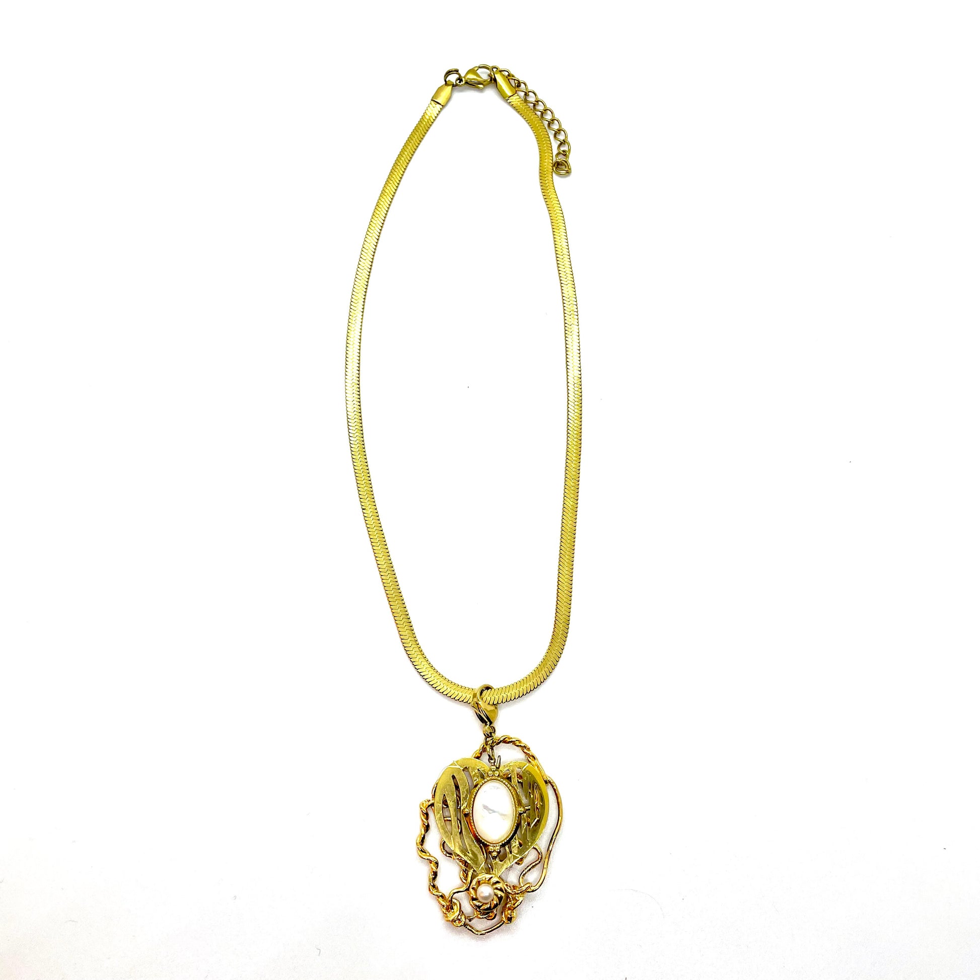 Le collier PENDENTIF KORA est très raffiné avec son médaillon créé en muselet de champagne doré à l'or fin 24K surmonté d'un coeur en métal doré dont le centre est une perle de forme ovale nacrée.