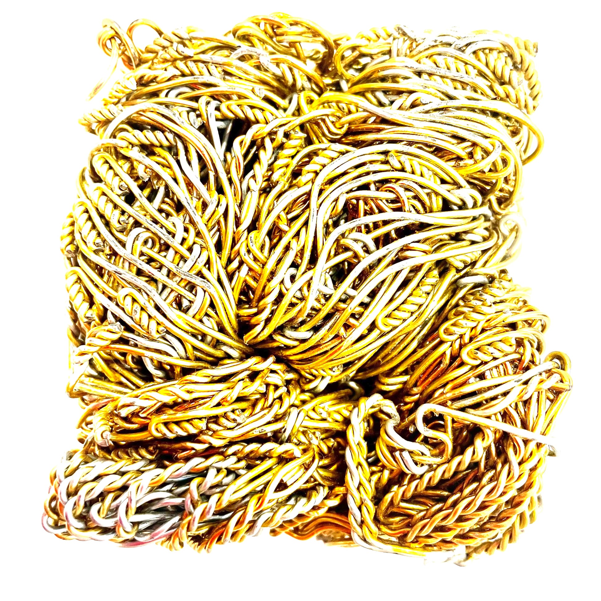 Le modèle RAÉCÉS fait partie de la collection de 4 compressions métalliques . Chacune d'entre elles rassemble plus de 200 muselets dorés dont la créatrice n'a plus besoin pour créer ses bijoux de champagne.