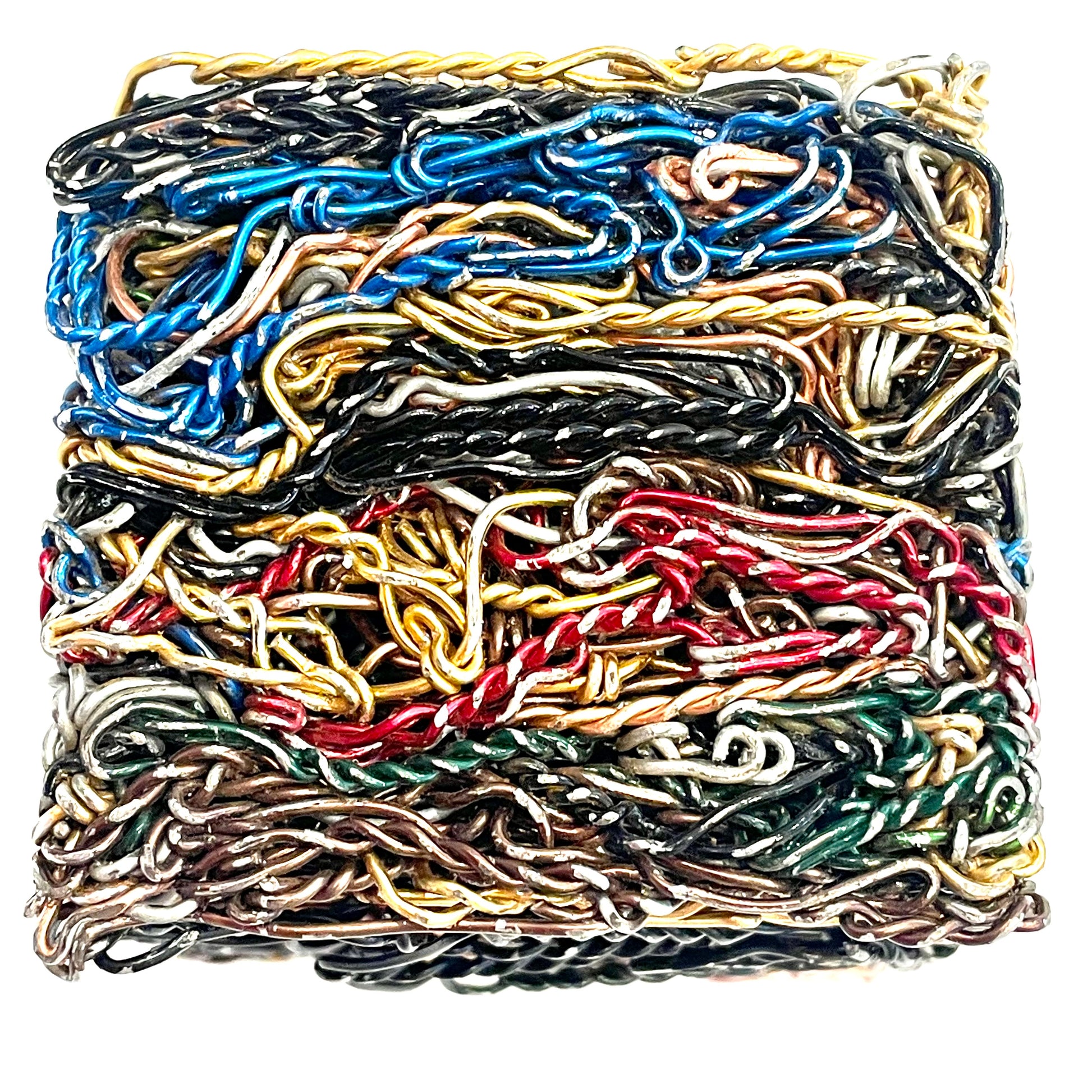 Le modèle SÉRÉAC fait partie de la collection de 4 compressions métalliques . Chacune d'entre elles rassemble plus de 200 muselets dorés dont la créatrice n'a plus besoin pour créer ses bijoux de champagne.