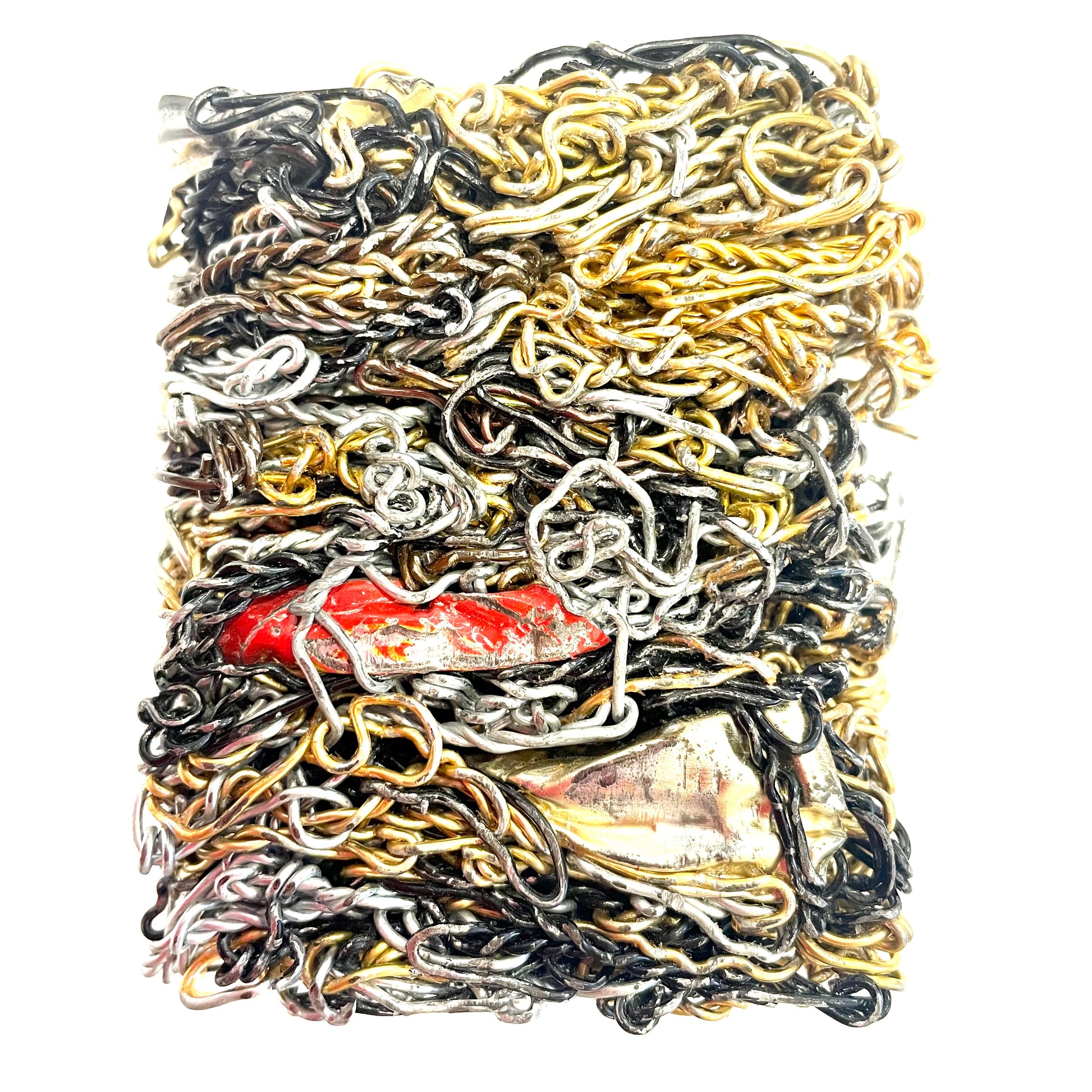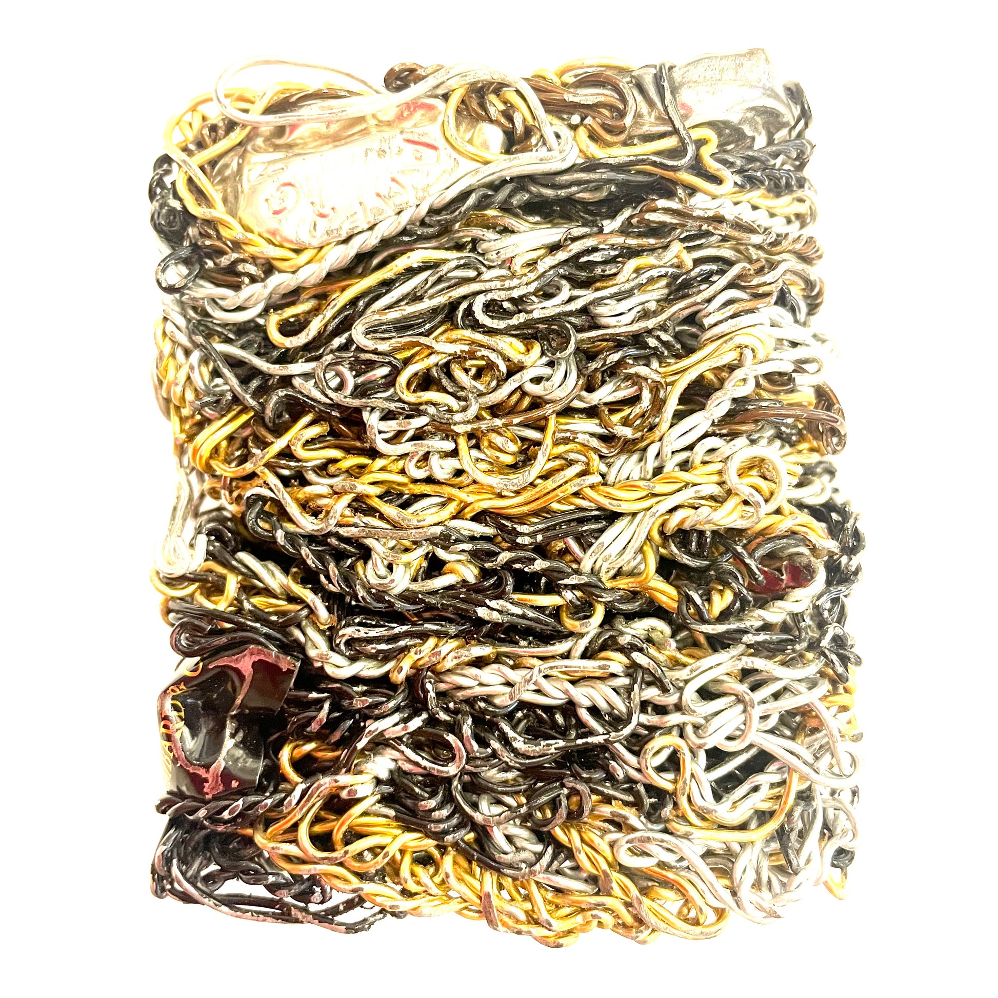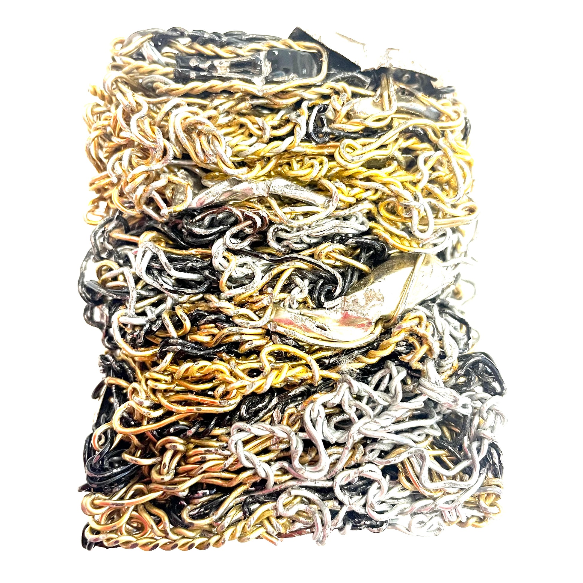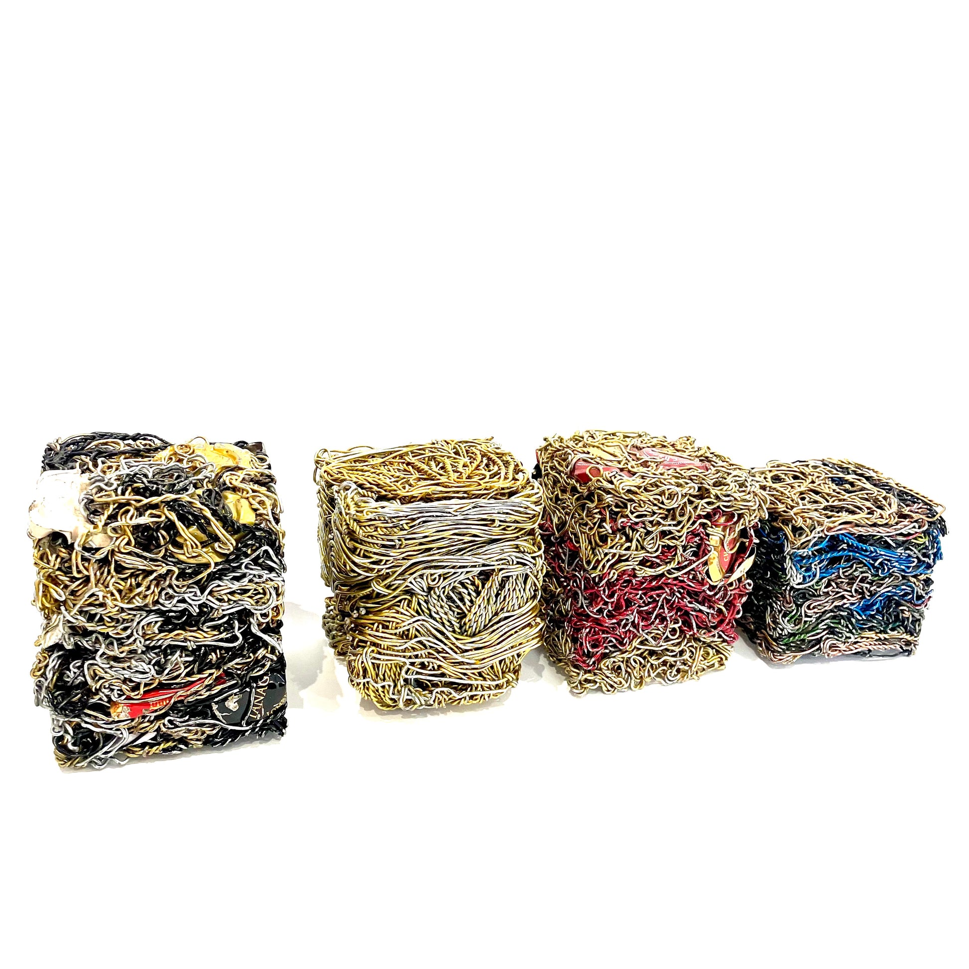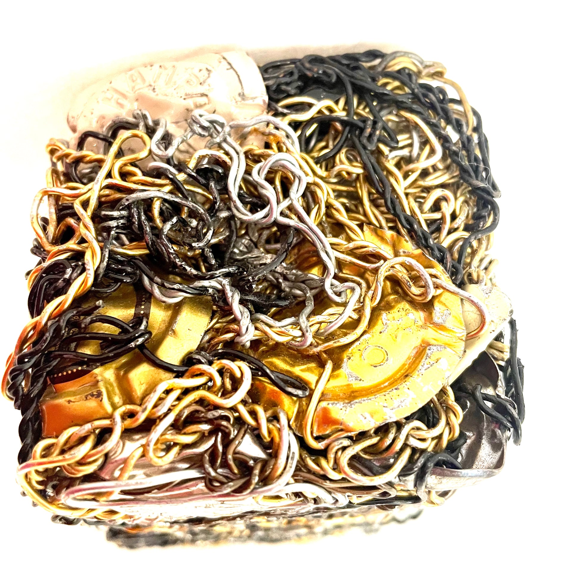 Le modèle CÉSARÉ fait partie de la collection de 4 compressions métalliques . Chacune d'entre elles rassemble plus de 200 muselets et capsules dorés, argentés et noir dont la créatrice n'a plus besoin pour créer ses bijoux de champagne.