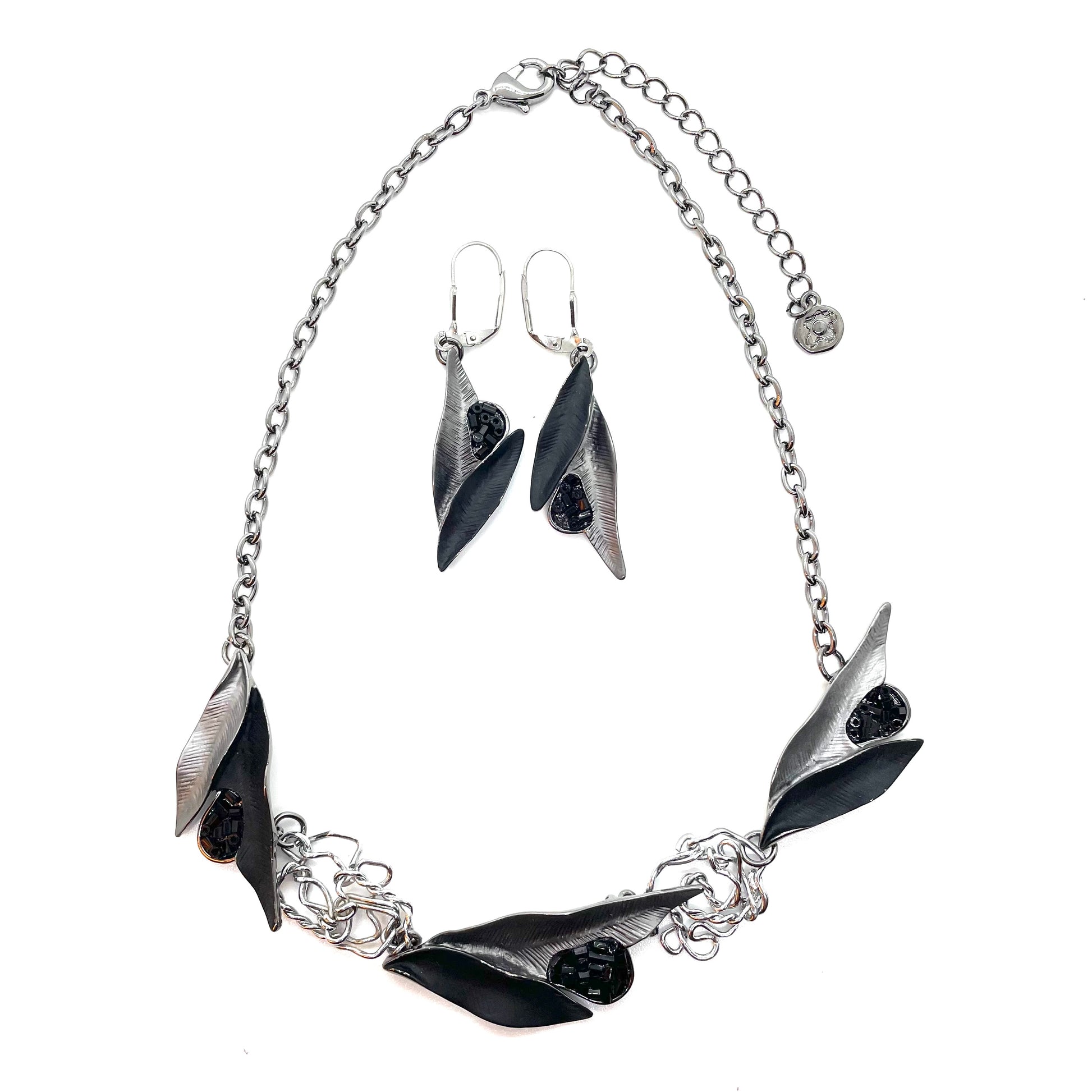 La parure DIVA collier et boucles d'oreilles avec dormeuses est indissociable créé avec une base de muselet de champagne façonné à la main et chromé par électrolyse avec un décor de feuille en acier inoxydable