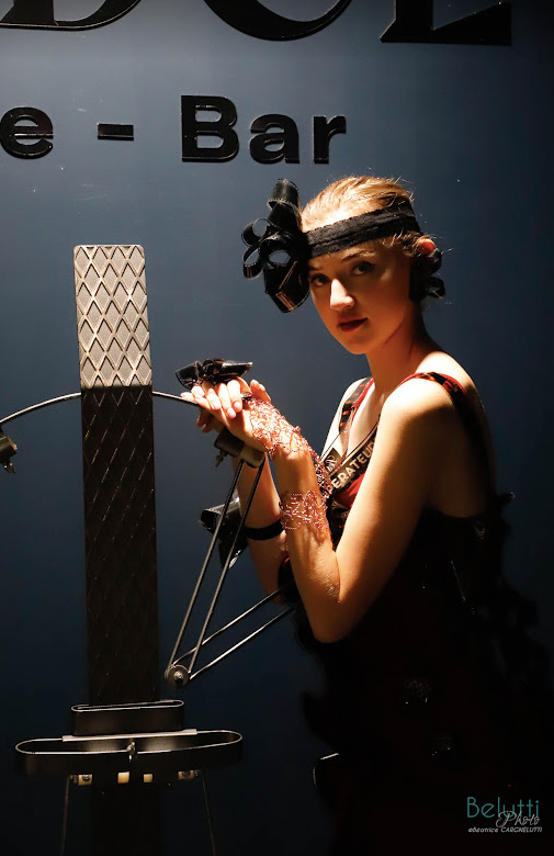 Le modèle se compose de pellicules de film 35mn et bandes sons cousues à la main sur un fond robe en jersey rouge souple .Elle se loue avec ses accessoires: accessoires cheveux, parure collier et boucles d'oreilles, bague et bracelet.