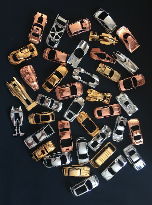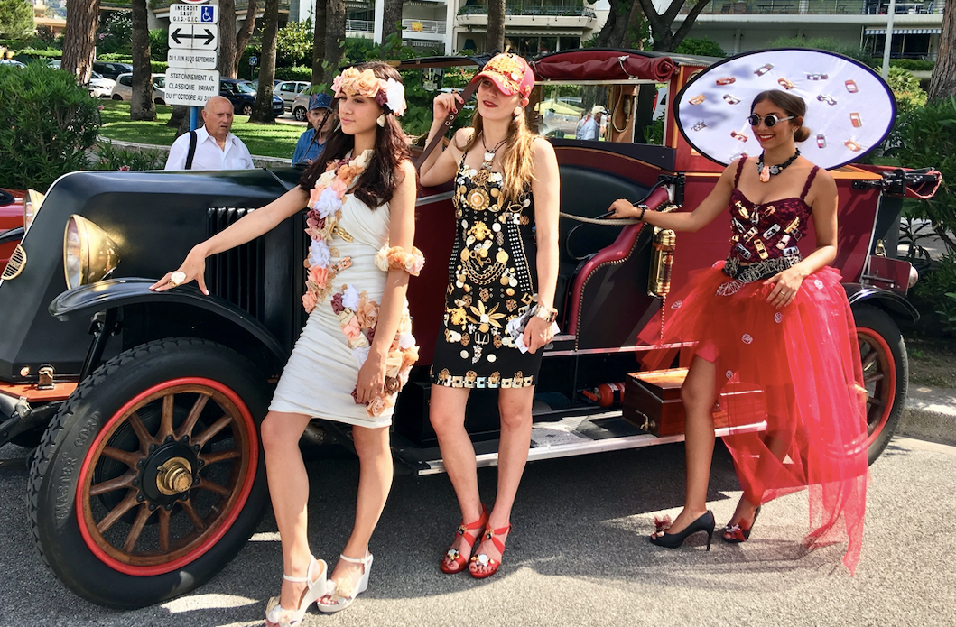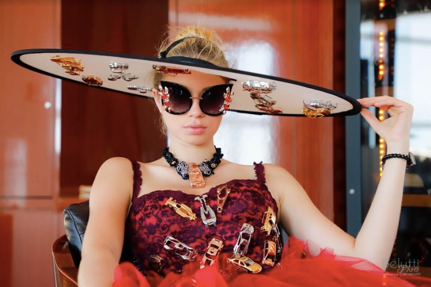 Entièrement confectionnée à la main par la styliste Corinne Reinsch avec un circuit de voitures miniatures en métal doré à l'or, chromé et cuivré cousu main sur la capeline , le bustier en panne de velours, sur la jupe en tulle rouge. et sur les escarpins.
