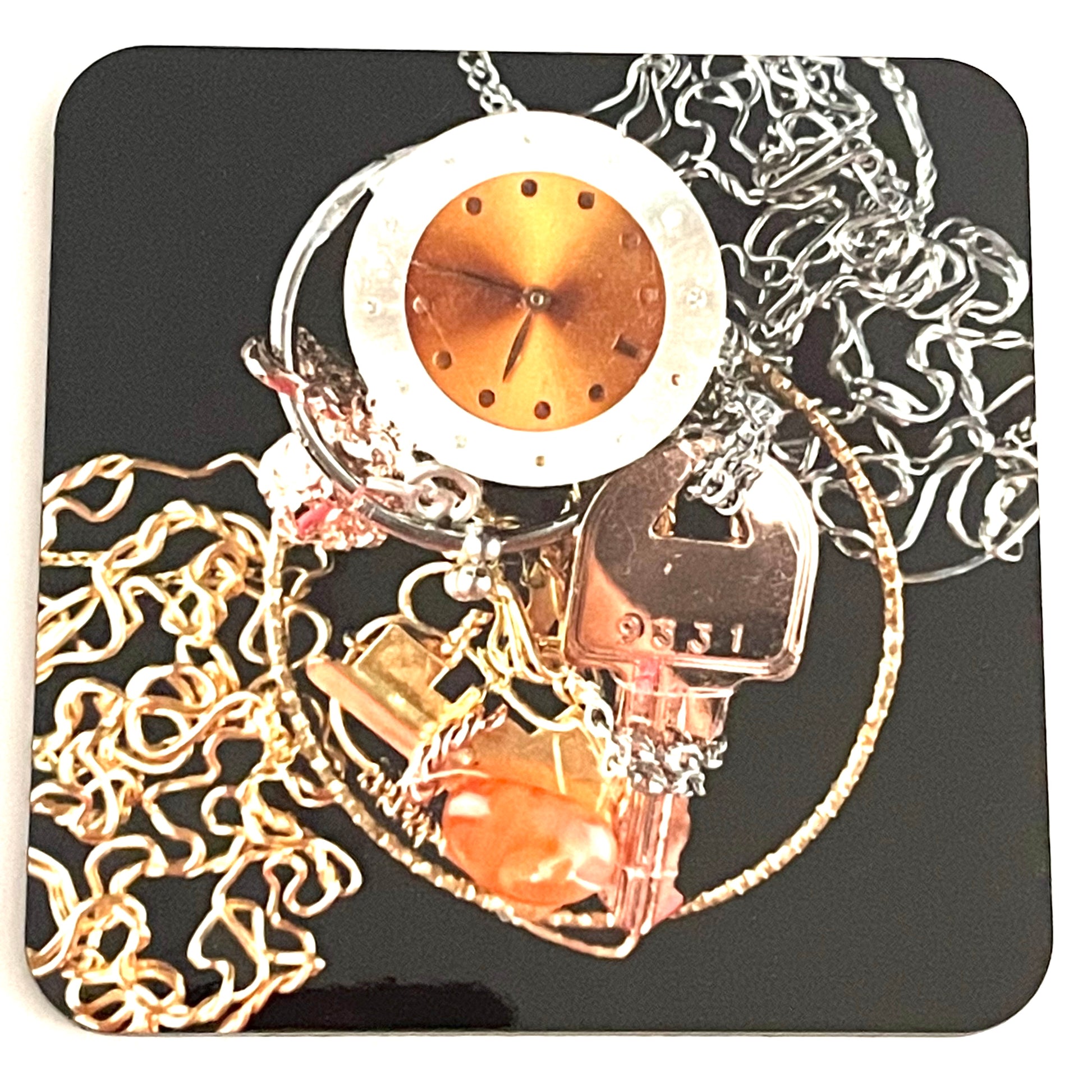 Objets décoratifs tels de petits tableaux de 9,5 x 9,5 cm , en bois stratifié ultra brillant de 2 mm d'épaisseur avec un liège anti-dérapant sur le verso .