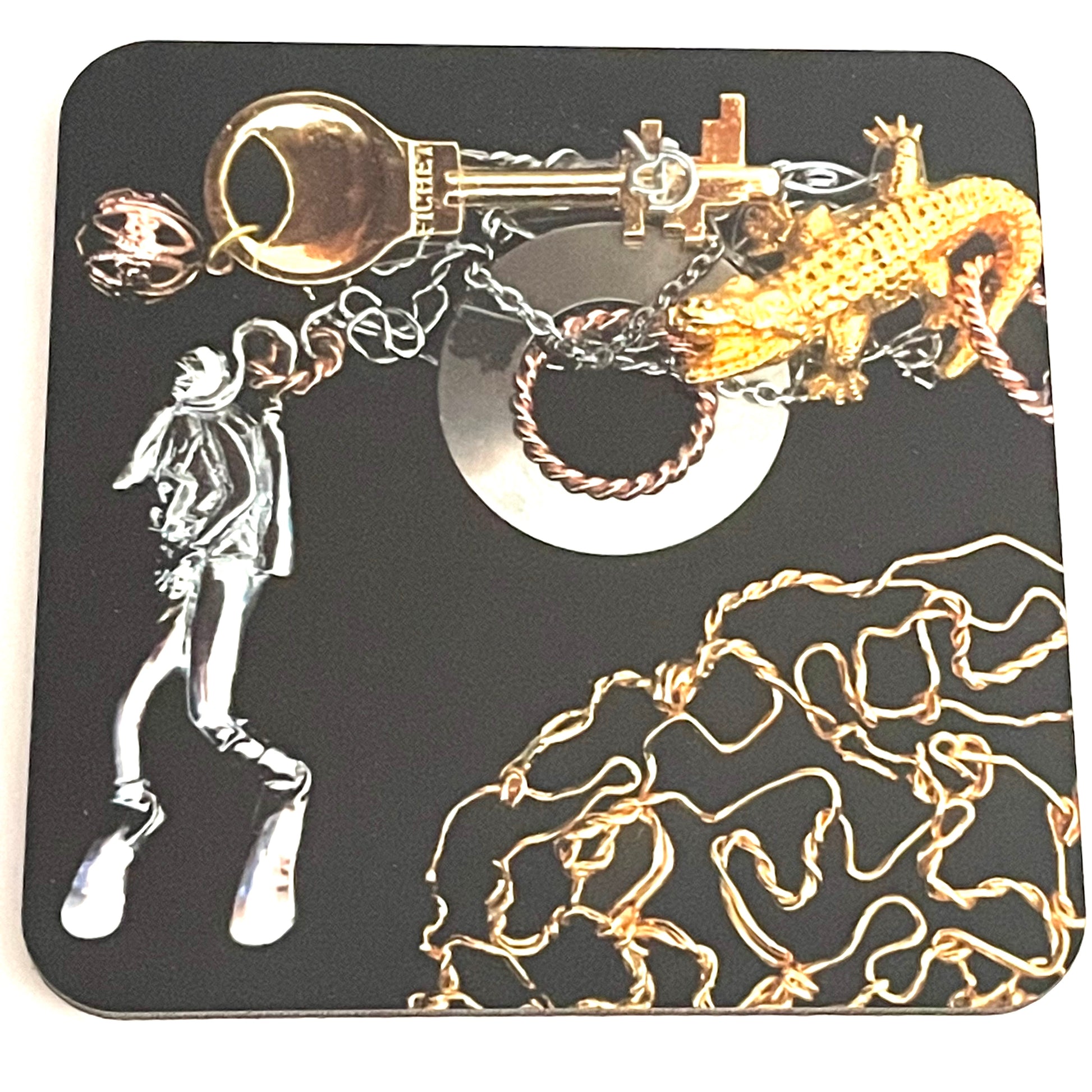Objets décoratifs tels de petits tableaux de 9,5 x 9,5 cm , en bois stratifié ultra brillant de 2 mm d'épaisseur avec un liège anti-dérapant sur le verso .