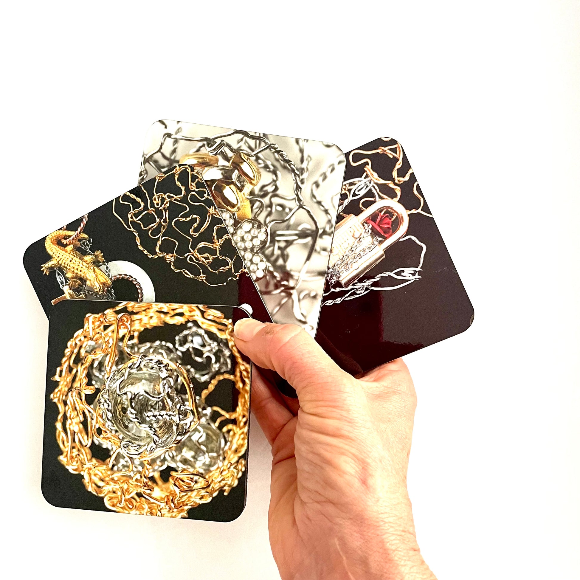 Objets décoratifs tels de petits tableaux de 9,5 x 9,5 cm , en bois stratifié ultra brillant de 2 mm d'épaisseur avec un liège anti-dérapant sur le verso .