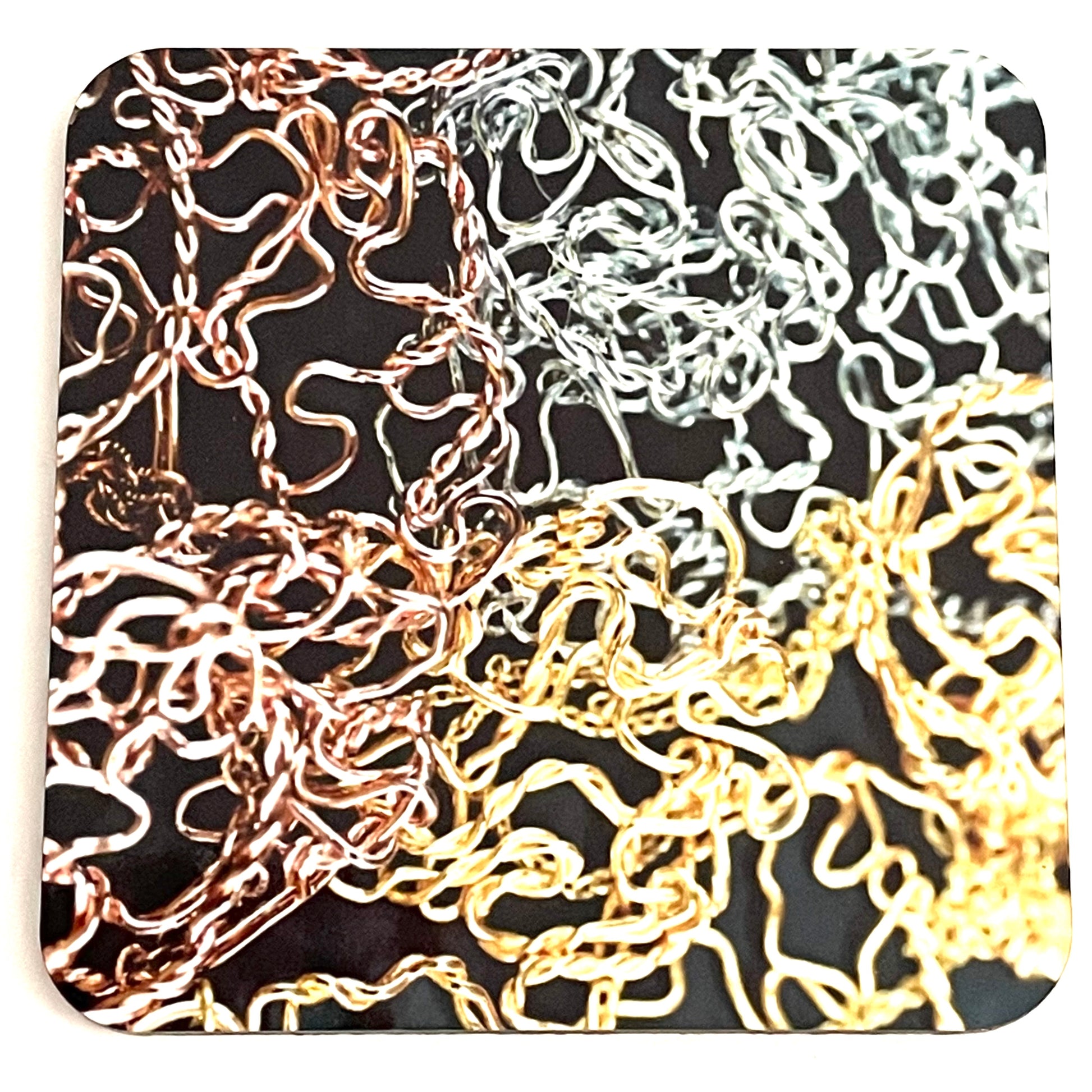 Objets décoratifs tels de petits tableaux de 9,5 x 9,5 cm , en bois stratifié ultra brillant de 2 mm d'épaisseur avec un liège anti-dérapant sur le verso .