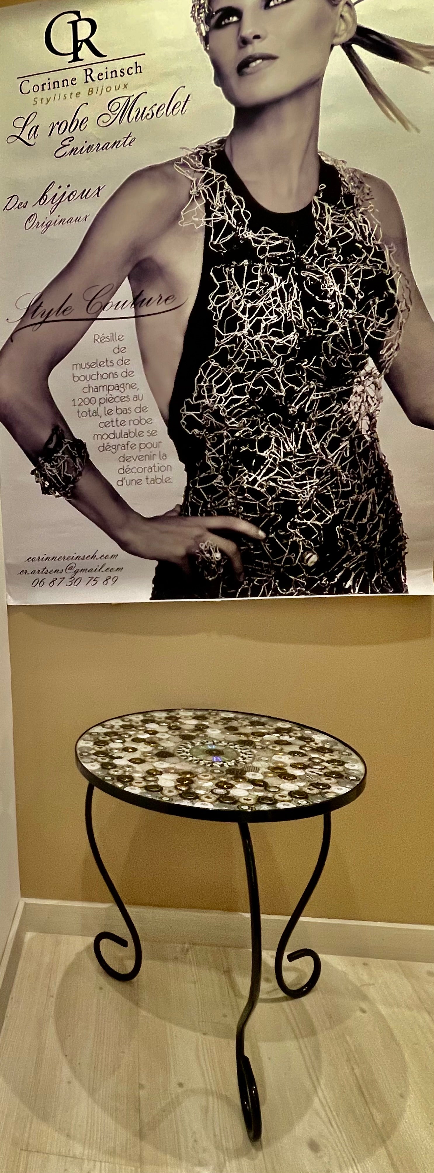 La table mandala DEUTZY est une création réalisée avec des plaques de bouteilles de champagne provenant des grandes maisons de champagne françaises.