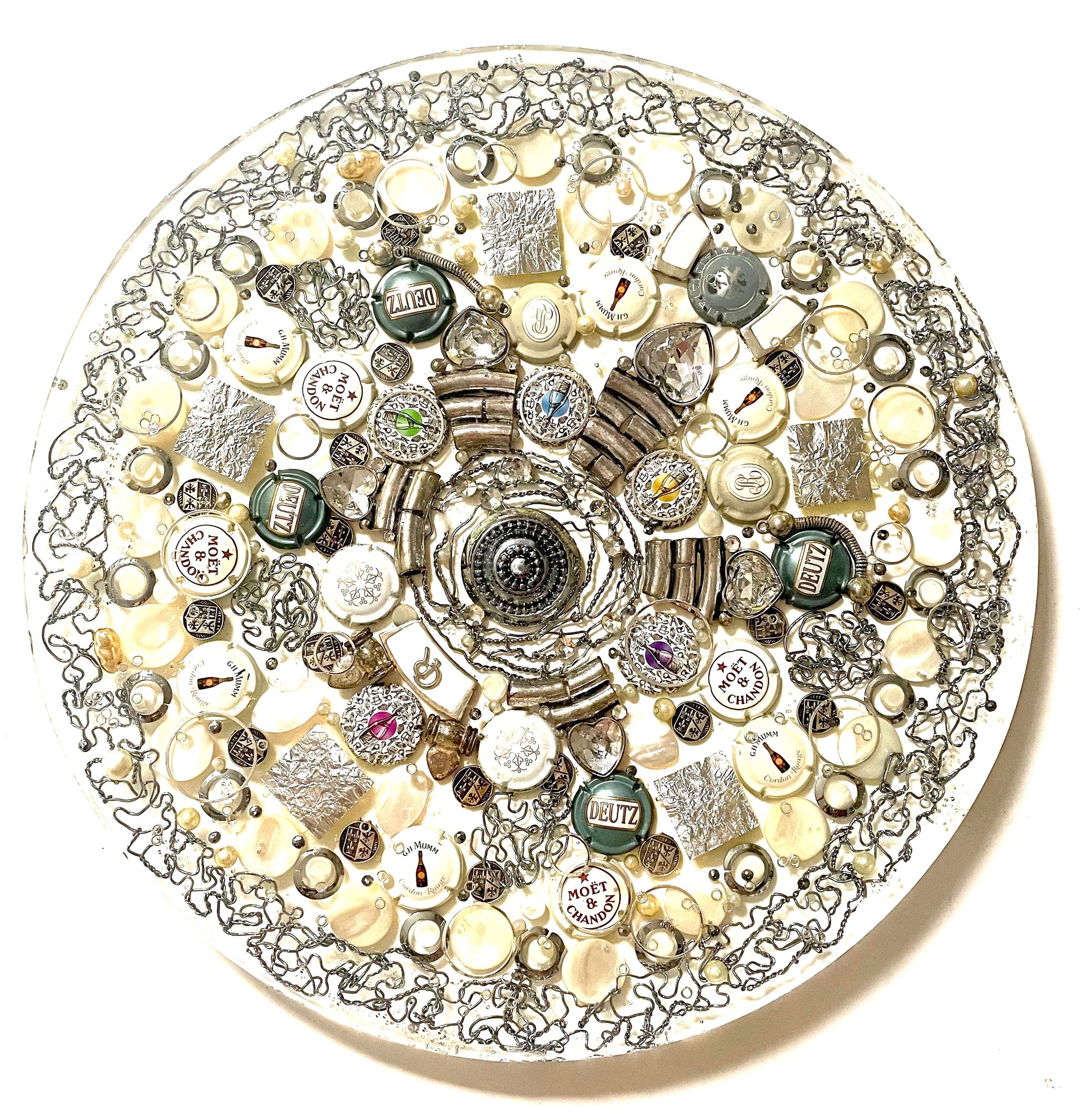 Le tableau mandala NACRY est une création réalisée avec des plaques de bouteilles de champagne provenant des grandes maisons de champagne françaises.